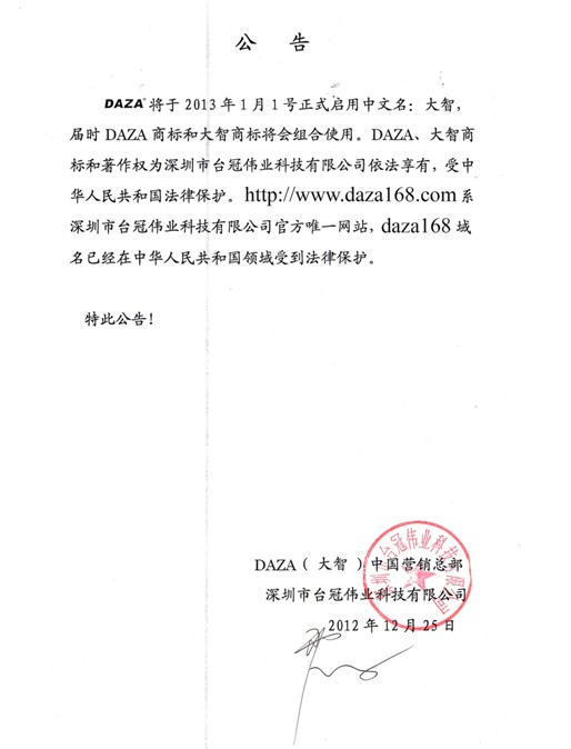 DAZA將于2013年1月1號正式啟用中文商標:大智,并和DAZA組合使用。