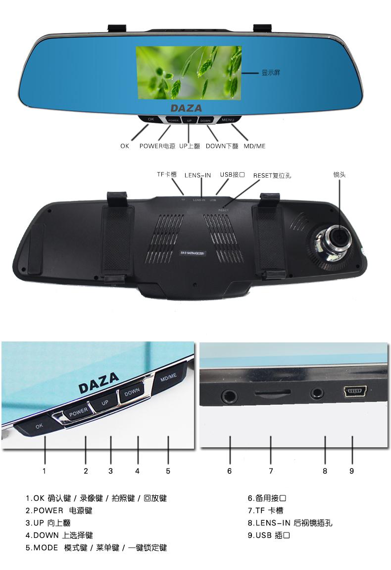 大智G822尺寸設(shè)計(jì)比較人性化,長(zhǎng)度32厘米,寬度9.7厘米,機(jī)身最薄處可達(dá)10mm,能夠很好的覆蓋原車后視鏡,保持原車原貌,同時(shí)也為駕駛員提供了更寬闊的后視視野。鏡子部分采用專業(yè)級(jí)防眩目藍(lán)鏡,能有效防止行車中炫目,防止視覺(jué)疲勞,從而保障行車安全。正面下方有五個(gè)按鍵,從左到右依次是OK鍵、電源鍵、上翻鍵、下翻鍵、菜單鍵。頂端有四個(gè)接口,分別是備用接口、TF卡位、后接鏡頭插孔、USB插口。另外G822最高支持32GB存儲(chǔ)擴(kuò)展。