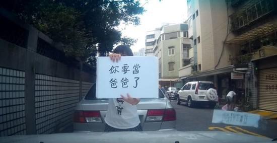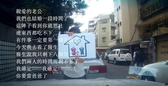 據臺灣媒體東森新聞云報道,一名叫Morihashi的網友發(fā)文,提到老婆說上禮拜開車與機車發(fā)生擦碰,要他調行車記錄儀視頻來看,沒想到卻收到一份大驚喜,他老婆花了1分多鐘、用一張張字卡說 ,你要當爸爸了!