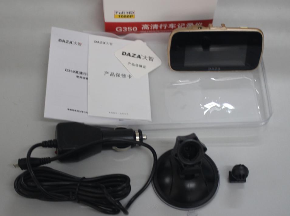 將大智G350高清行車記錄儀取出來,里面還有車充、吸盤、產(chǎn)品合格證、產(chǎn)品保修卡、產(chǎn)品說明書。