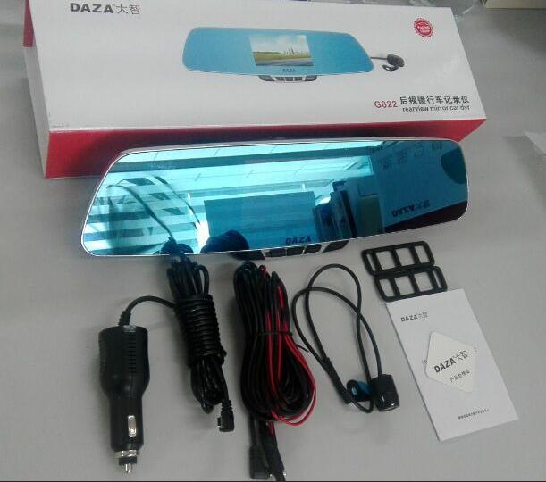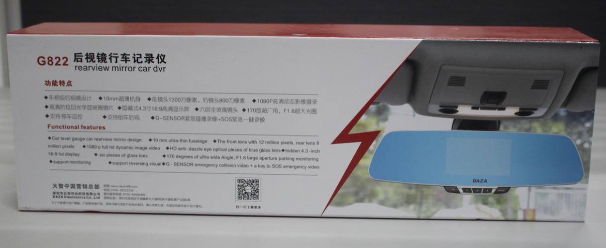 在禮品盒正面有大智的品牌LOGO、產品型號和一張產品圖片,讓人非常直觀的了解G822是大智推出的一款后視鏡雙鏡頭行車記錄儀!