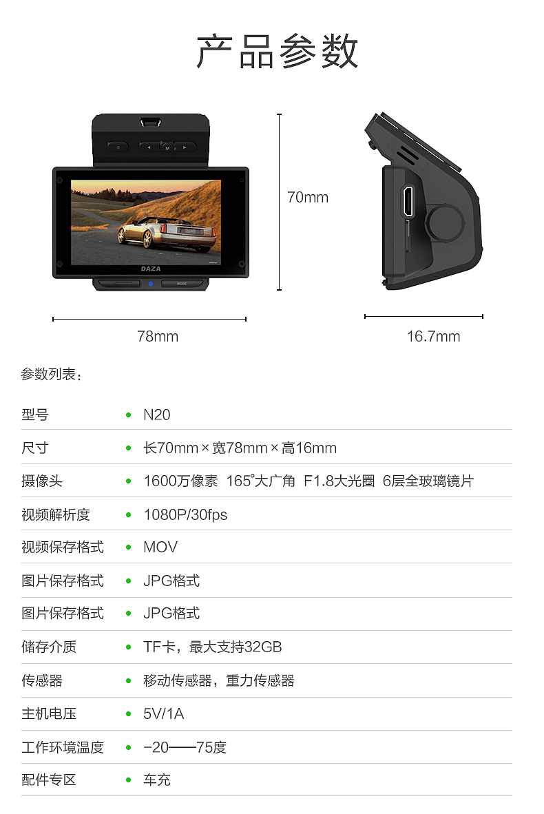 傳統(tǒng)的行車記錄儀有一些會擋了駕駛的視線,那么試一試下面這款小巧美觀,不影響視線,不破壞原車內(nèi)飾和風(fēng)格,安裝方便的迷你隱藏式行車記錄儀-大智N20。這款機(jī)器錄像清晰度堪比數(shù)碼相機(jī),采用NTK96650圖像處理器,配備6層全玻鏡頭模組,水平165度拍攝廣角,輕松覆蓋4條車道。F1.8大光圈,夜間高清畫質(zhì),支持1920*1080P 30幀/秒 MOV高清格式視頻錄制等,憑借大智十二年高清技術(shù)的支持,一直深受五星好評。