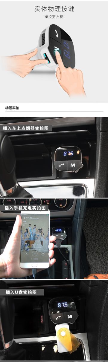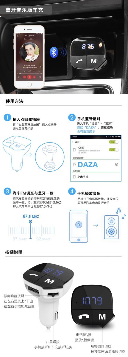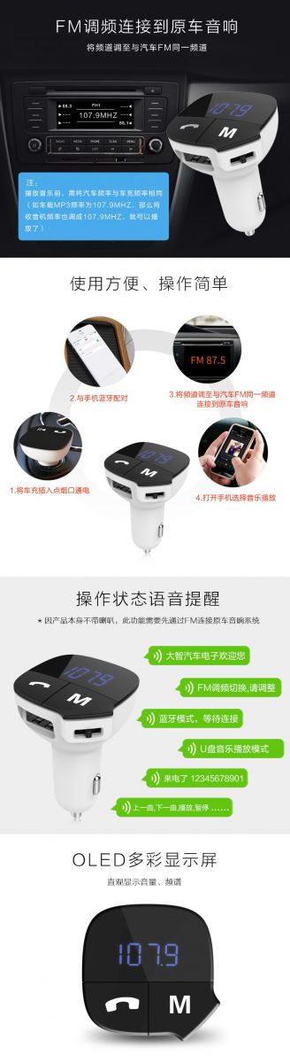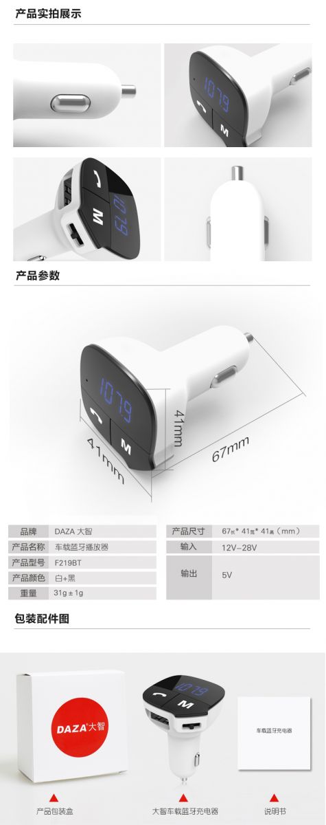 大智車載藍牙車充F219是一款所有車主都用的上車載充電器,它把藍牙電話/音樂、音樂播放器、車載充電器三個實用的功能合為一體,讓車主駕駛時安心開車,避免分心。下面這張圖讓你一分鐘了解大智車載藍牙充電器F219。